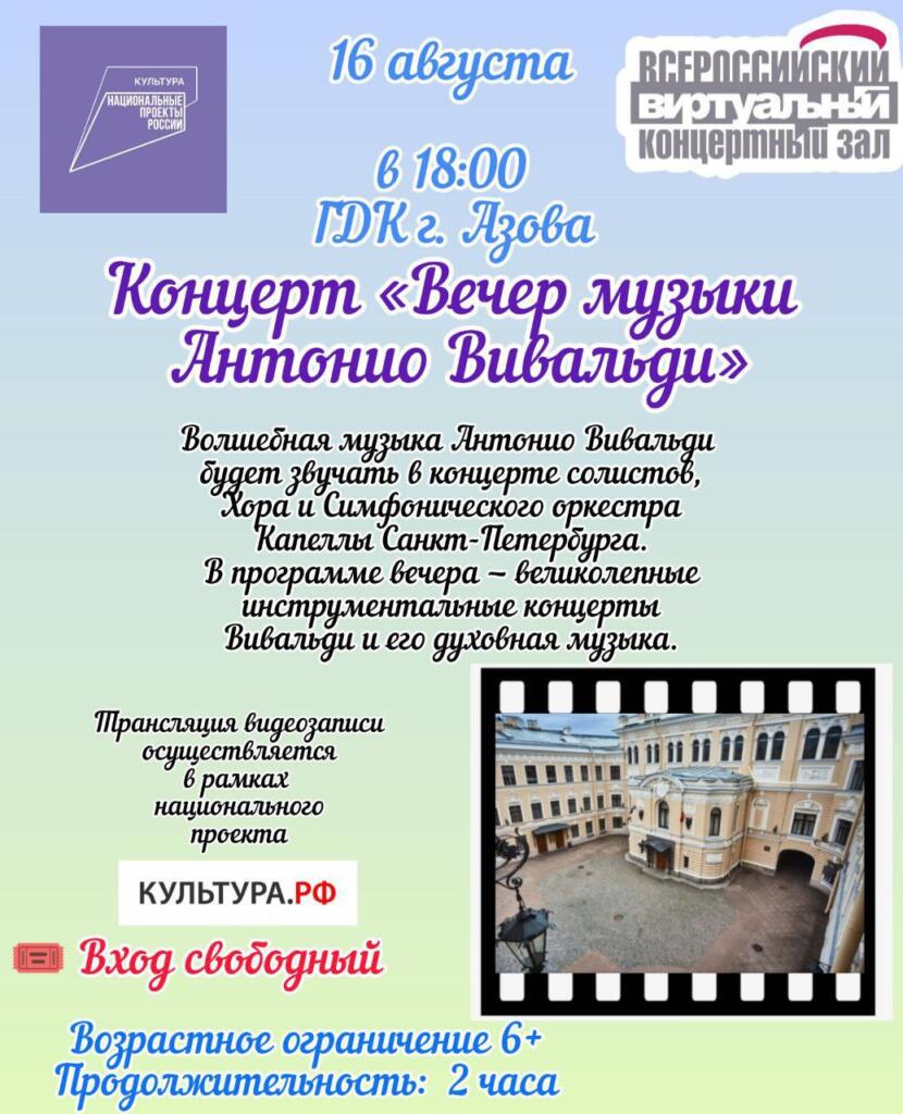 16 июня в 18:00 в ГДК Азова состоится виртуальный концерт «Вечер музыки Антонио Вивальди». В исполнении солистов, хора и симфонического оркестра Капеллы Санкт-Петербурга прозвучат великолепные инструментальные концерты и духовная музыка композитора.