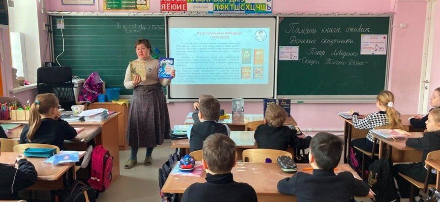 Ребята с помощью презентации познакомились с удивительной судьбой писателя-земляка: его детством в Азове, героической службой фронтовым лётчиком и послевоенным творческим путём. Школьники узнали, что Лебеденко — автор любимых многими поколениями книг: «Сказки Тихого Дона», «Клуб отважных», «Доброе сердце дороже красоты» и других.