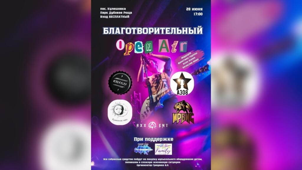 28 июня в 17:00 в парке «Дубовая Роща» села Кулешовка состоится благотворительный концерт. Мероприятие организовано для сбора средств на приобретение музыкального оборудования детям, оказавшимся в трудной жизненной ситуации.