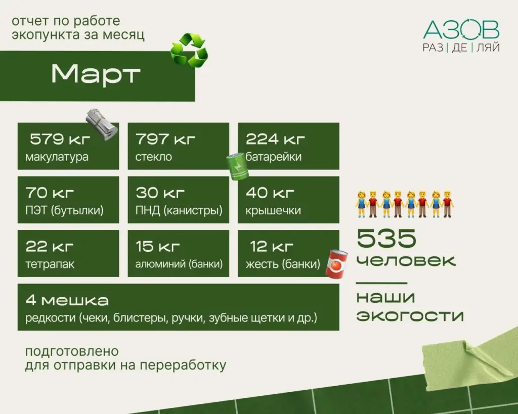 В прошедшем месяце активисты экологического движения подвели итоги по сбору вторсырья. Март выдался продуктивным: общими усилиями удалось собрать и подготовить к отправке на переработку значительный объем отходов