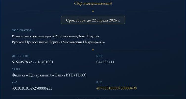 Желающие помочь могут перечислить любую сумму пожертвований на расчетный счет Ростовской-на-Дону епархии.