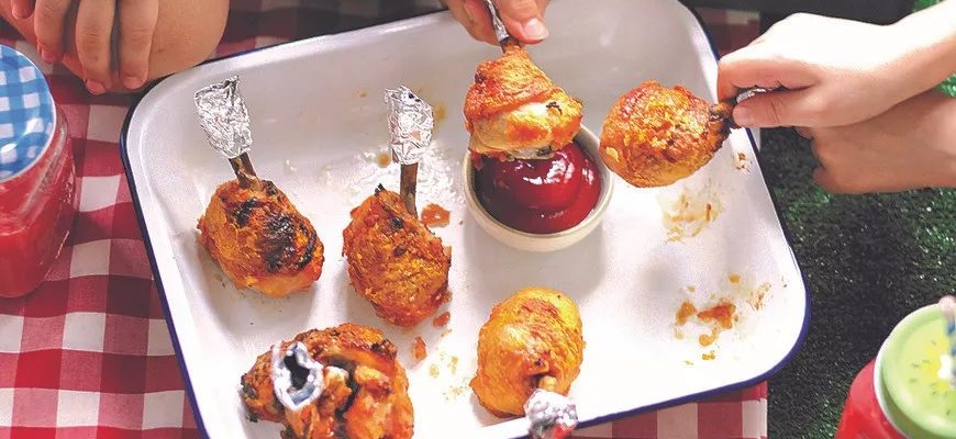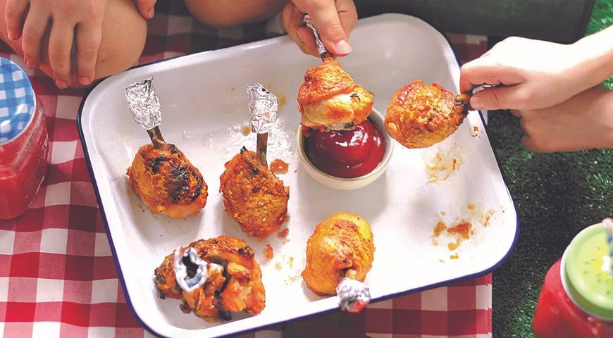 Для придания полноценного «карамельного» вида ножкам понадобится маринад на основе соевого и томатного соуса с добавлением сахара и одна столовая ложка кукурузного крахмала. Процесс жарки займет не более 10 минут – мясные «петушки на палочке» готовы. Подавайте их с домашним кетчупом или аджикой, предварительно обернув косточку фольгой.