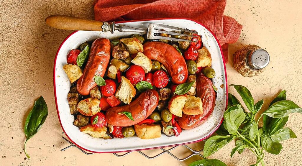 Разогрейте духовку до 180 °С. В жаропрочную форму положите баклажаны, перец, томаты черри, чеснок и оливки, посолите, поперчите и перемешайте, влейте бульон. Выложите на овощи сардельки и хлеб. Запекайте 20–25 мин. Подавайте, посыпав листочками базилика.