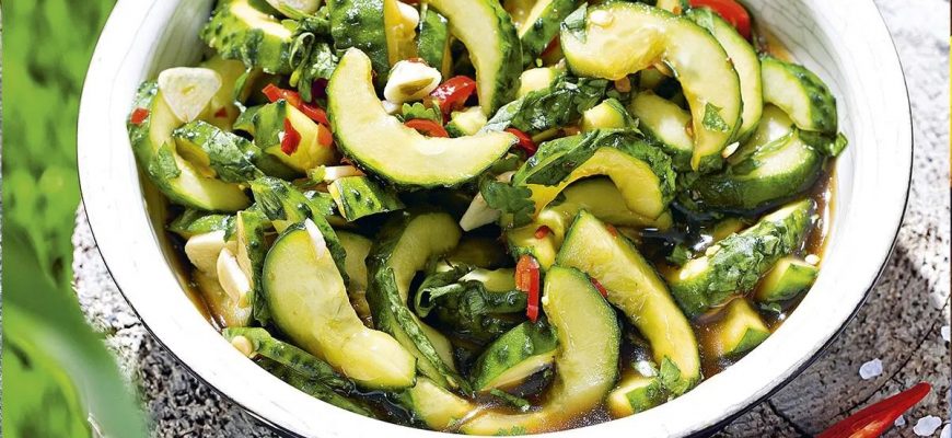 Чтобы приготовить такой оригинальный специалитет, вам потребуются свежий огурец, чеснок, перец чили, кинза, соевый соус и всего 10 минут на весь процесс готовки. При желании можно добавить в маринад немного семечек кунжута — именно так готовят свои знаменитые битые огурцы китайцы. Подавайте ароматные маринованные огурцы к любому мясу, к шашлыкам — обязательно. Хороши они будут также с вареной или запеченной картошкой.
