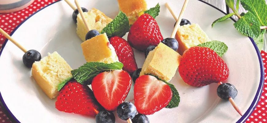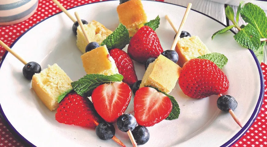 У нас русский вариант выпечки – невероятно нежный – с добавлением кефира либо простокваши и сливочного масла. При необходимости можно сделать даже веганский. В этом случае заменой яйцам станет крахмал, разведенный в воде. И то, и другое необходимо для этого вида теста, иначе в процессе выпекания оно опадет и не будет пышным, как ему положено. После приготовления сложной части сладкого блюда останется самая ответственная: аккуратно нанизать на шпажки ягоды, кубики печенья и красиво уложить всё на тарелку или в невысокие широкие бокалы.