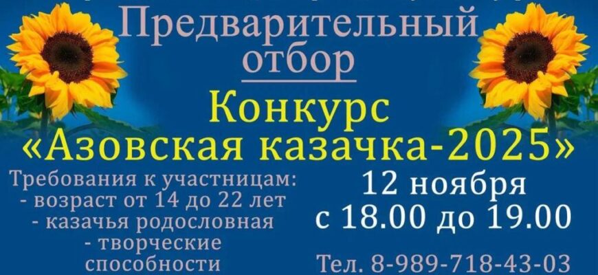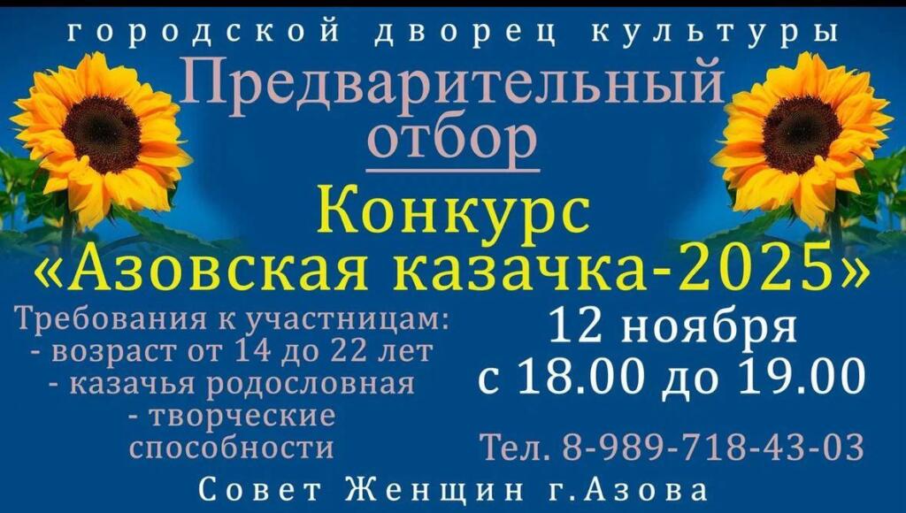 В Городском дворце культуры Азова 12 ноября пройдет предварительный отбор участниц конкурса «Азовская казачка – 2025». Мероприятие запланировано с 18:00 до 19:00.