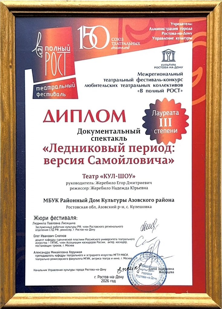 Народный театр эстрады «КУЛ-ШОУ» успешно представил свой спектакль «Ледниковый период. Версия Самойловича» на Втором Межрегиональном театральном фестивале «В полный рост», который состоялся в Ростове-на-Дону при поддержке Союза Театральных Деятелей Российской Федерации