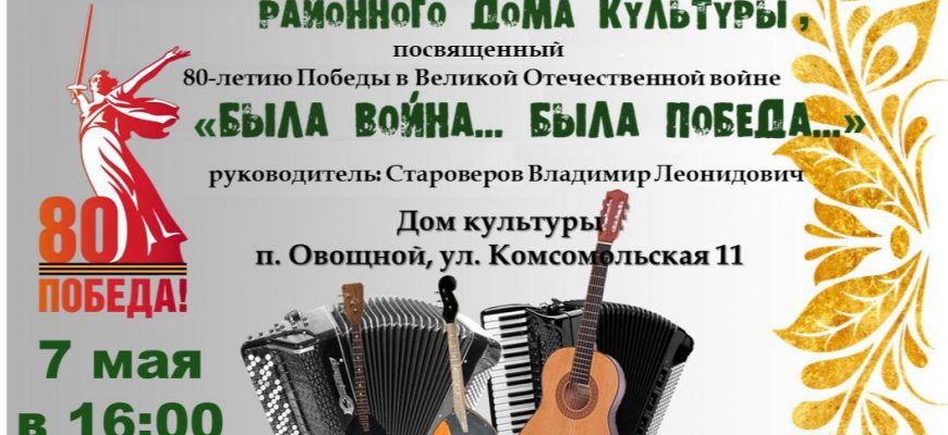 Концерт состоится 7 мая в 16:00 по адресу: п. Овощной, ул. Комсомольская, 11 (Дом культуры).