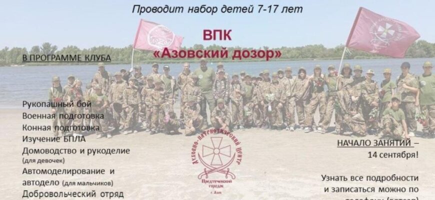 Духовно-патриотический центр «Предтеченский городок» объявляет о наборе детей и подростков от 7 до 17 лет в военно-патриотический клуб «Азовский дозор» на новый учебный год. Начало занятий запланировано на 14 сентября.