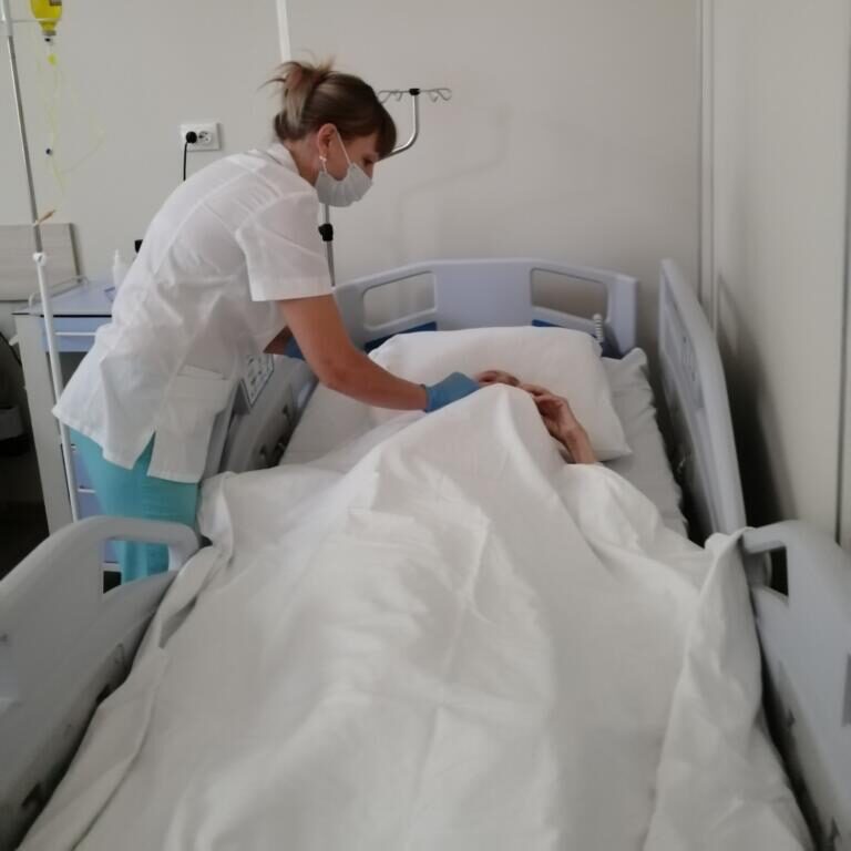 Сотрудники медучреждения в стационаре сосредоточены на борьбе с болью, тошнотой, отеками, одышкой. Пациентов кормят, одевают, моют, ухаживают за ногтями, волосами, кожными покровами, различными стомами  и катетерами. Для паллиативного отделения большой помощью стали кресла-каталки. За кроватями и столиками получили и кресла. Кресло для человека, который находится постоянно в постели – настоящий праздник. Медперсонал паллиативного отделения старается в свой дворик вывезти пациентов, чтобы они ощутили дыхание ветра, полюбовались пейзажем, понаблюдали за ритмом жизни или просто подышали. Родным и близким также рекомендуют в хорошую погоду на улице провести время встреч, если это не противопоказано пациенту.
