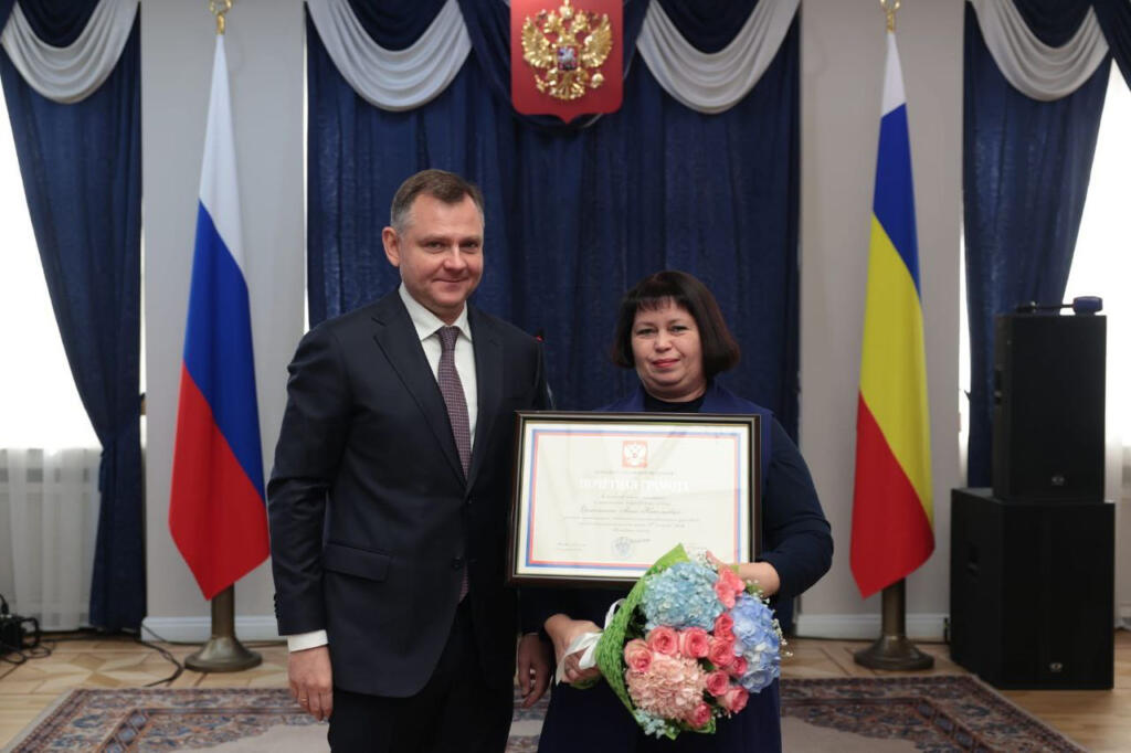 Почётную грамоту Президента Российской Федерации ей вручил губернатор Ростовской области Юрий Борисович Слюсарь. Награда является признанием высокого профессионализма и заслуг педагога в деле воспитания и обучения подрастающего поколения.