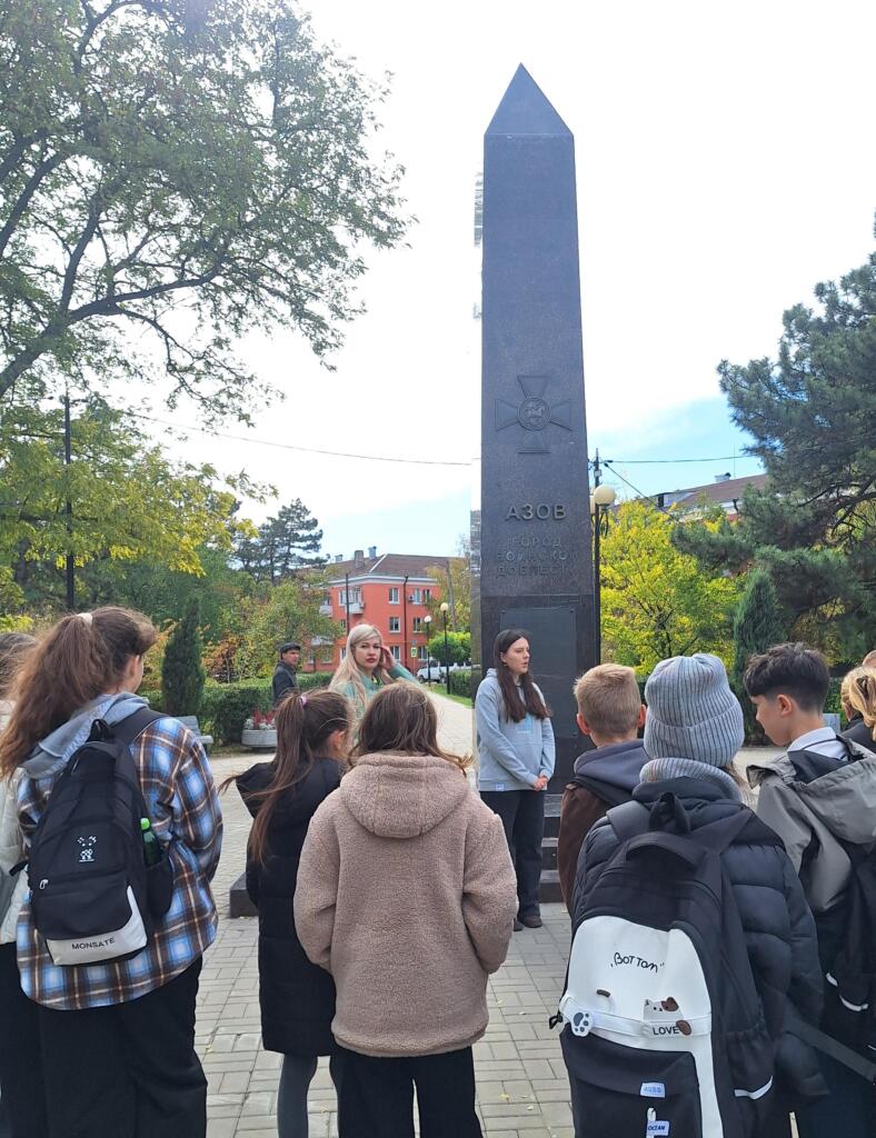 Дружная колонна пятиклассников проследовала от памятника комсомольцам к стеле «Азов — город воинской доблести». Здесь экскурсовод Кристина Пасика рассказала детям, что наш город стал первым в Ростовской области, удостоенным такого почётного титула. Стела была открыта 8 мая 2018 года. Существует легенда, что она была хорошо видна из окон ветерана Николая Неживенко, который освобождал город от немецко-фашистских захватчиков.