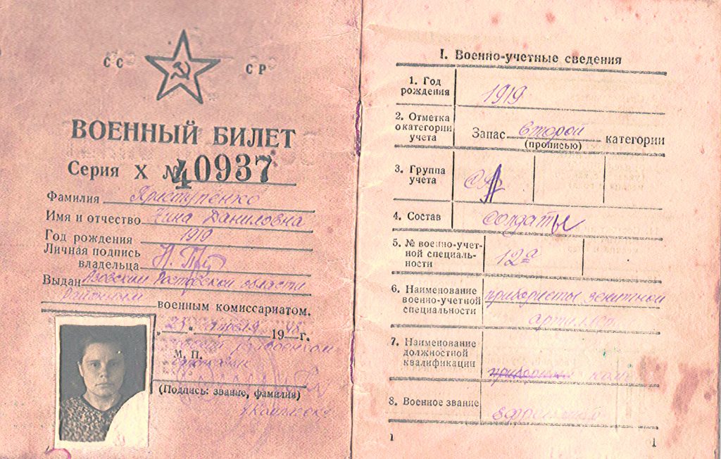 Нина Даниловна родилась 27 декабря 1919 года. В апреле 1942-го мобилизована Азовским РВК, и зачислена в 11-й отдельный зенитно-артиллерийский дивизион. С апреля 1943-го до конца войны служила в штабе 4-й воздушной армии.