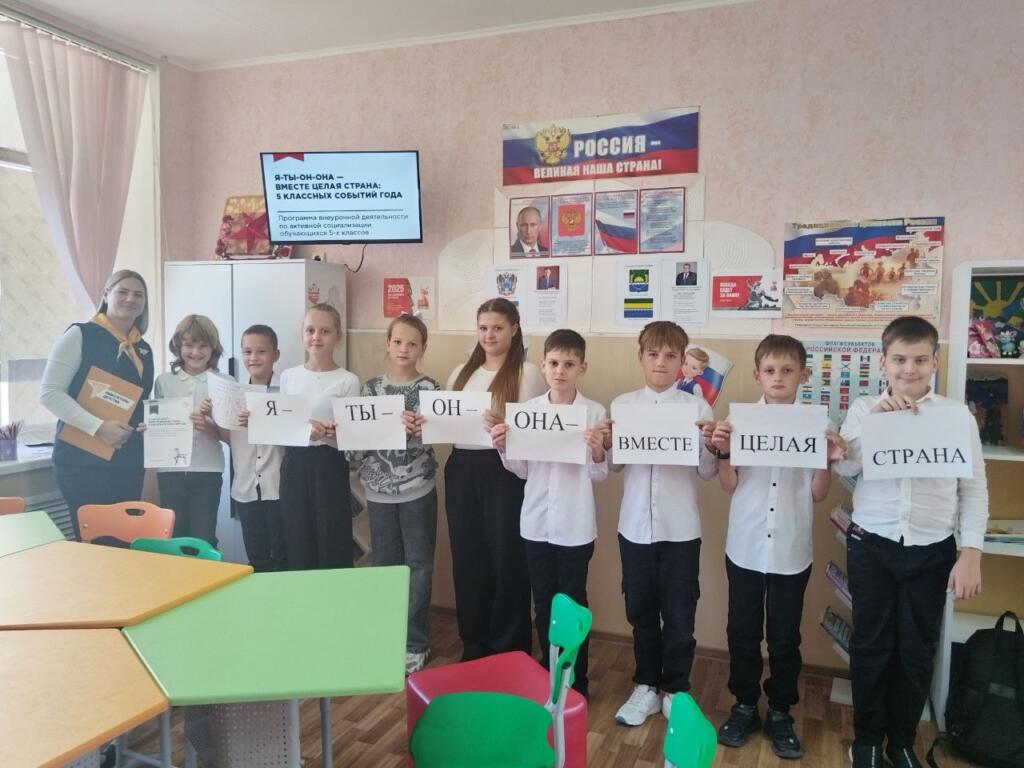 В Семибалковской СОШ Азовского района советник директора по воспитанию и взаимодействию с детскими общественными объединениями Иванова М.Г. познакомила пятиклассников с программой «Я-ТЫ-ОН-ОНА – ВМЕСТЕ ЦЕЛАЯ СТРАНА».