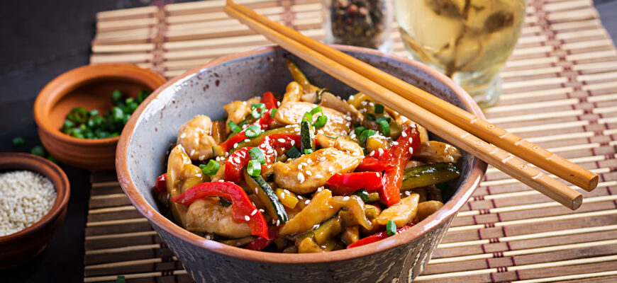 Хрустящие кусочки курицы, обжаренные во фритюре или на сковороде, покрытые ярким, блестящим кисло-сладким соусом с кусочками овощей.