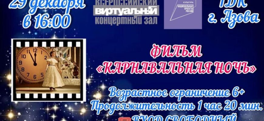 В предновогодние дни Городской дворец культуры Азова приглашает жителей и гостей города на специальный показ культового советского фильма «Карнавальная ночь».