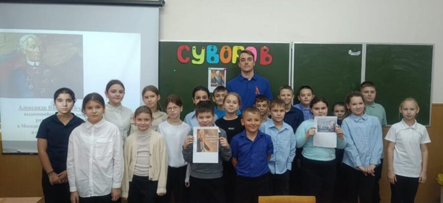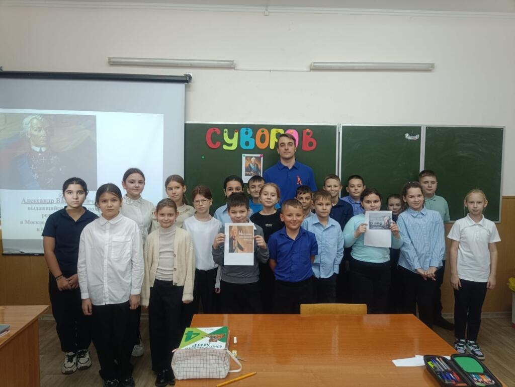 В честь этой знаменательной даты учащиеся 4 «В» класса, активисты движения «Орлята России», приняли участие в тематическом мероприятии. Студент ЮФУ Александр Галаган познакомил ребят с биографией генералиссимуса и его величайшими сражениями. Штурм неприступной крепости Измаил, легендарный переход через Альпы, блестящие победы над турецкой и французской армиями – каждый из этих эпизодов является шедевром военного искусства. Продуманность суворовских стратегий и умение предвосхищать действия противника вдохновляли солдат на настоящие подвиги. Даже Наполеон Бонапарт признавал его величие, говоря: «Этот человек – чудо-богатырь!».