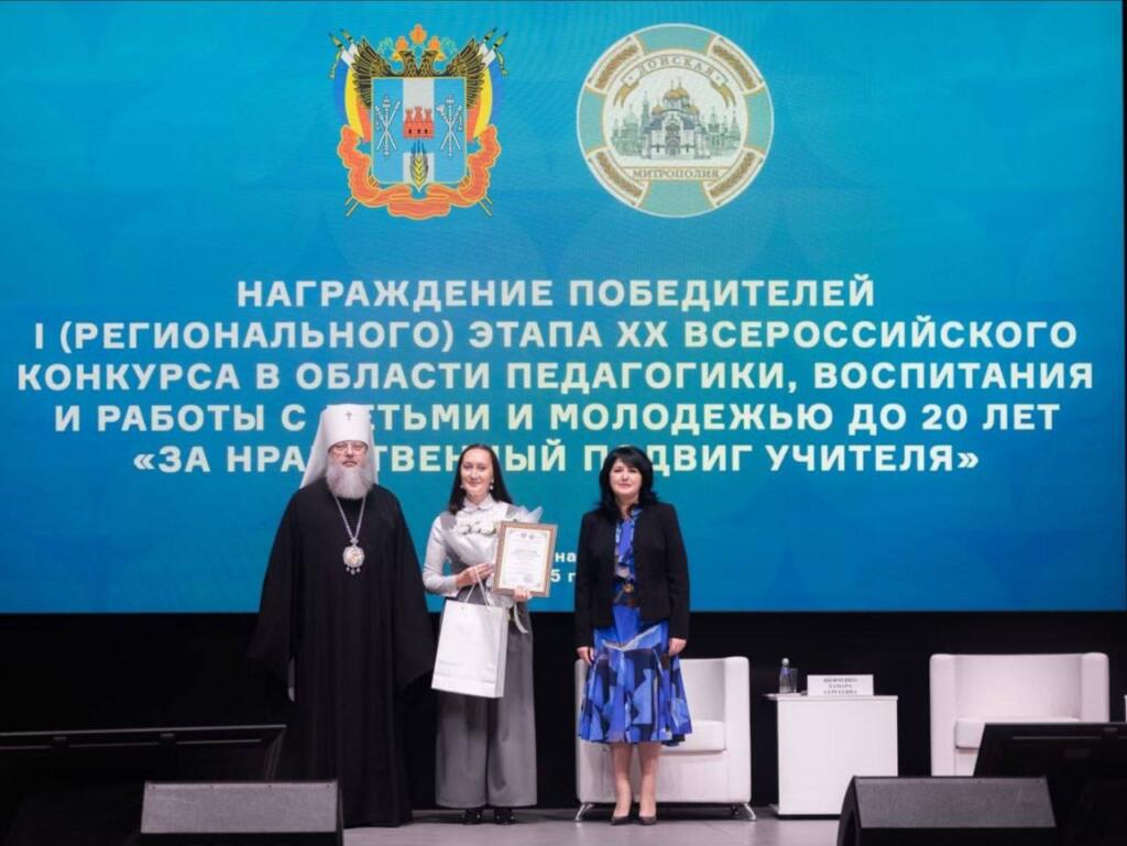 Диплом победителя Марине Александровне вручили митрополит Ростовский и Новочеркасский Меркурий и министр общего образования Ростовской области Тамара Шевченко.