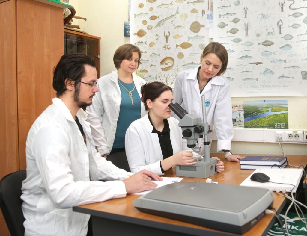 На фото (слева направо): кандидат биологических наук Мария Белая, кандидат сельскохозяйственных наук Татьяна Старикова, рыбоводы Сергей Спиридов и Динара Палий, ихтиопатолог Юлия Степанова.