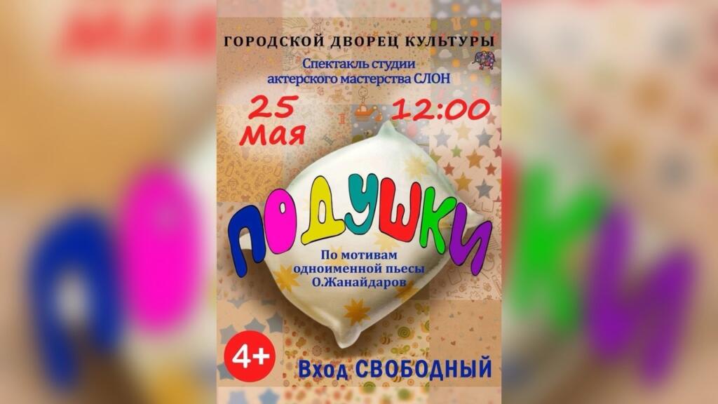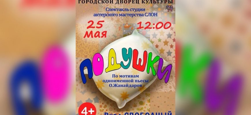 25 мая в 12:00 младшая группа студии актерского мастерства «Слон» покажет трогательную и поучительную сказку «Подушки», поставленную по мотивам пьесы О. Жанайдарова.