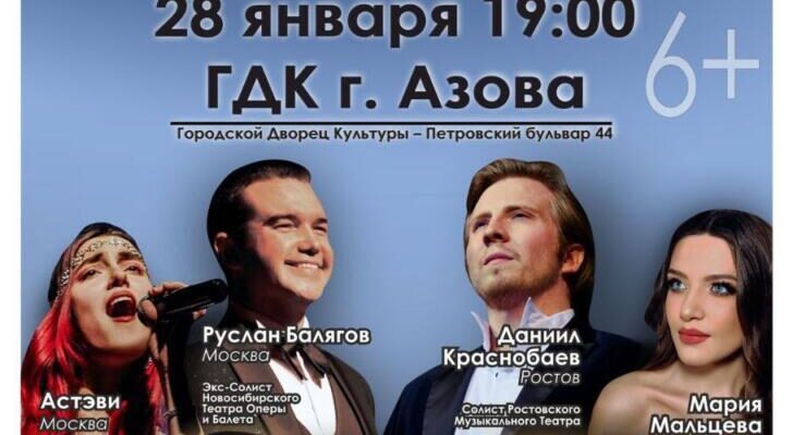 В конце января Городской дворец культуры Азова станет площадкой для уникального музыкально-поэтического вечера. 28 января на сцену выйдут солисты музыкальных театров, лауреаты всероссийских и международных конкурсов в рамках концерта «АЗОВ — МОСКВА».