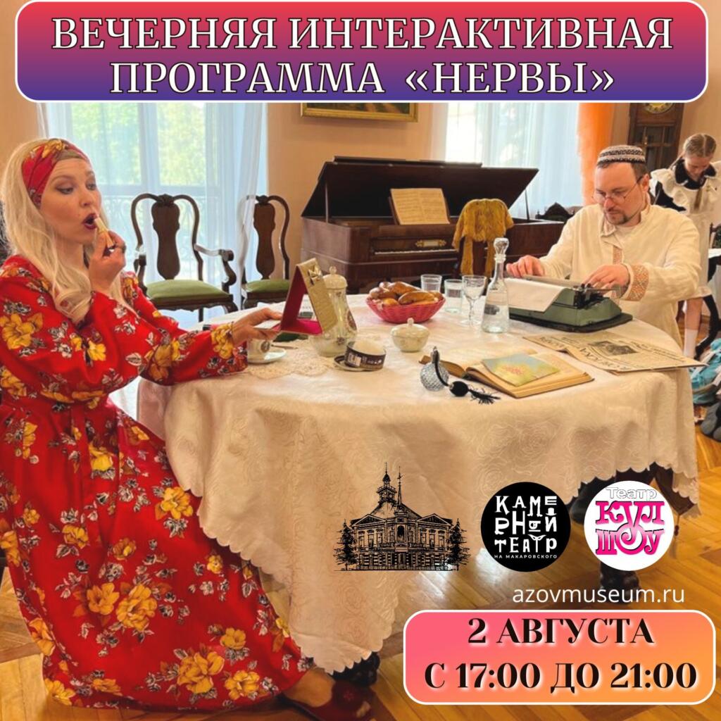 2 августа в музее Азова состоится вечерняя театрализованная программа «Нервы», посвящённая творчеству советских писателей-сатириков Михаила Зощенко и Григория Горина. Гостей ждёт погружение в забавные бытовые ситуации, курьёзные истории и искромётный юмор в исполнении актёров театра «КУЛ-ШОУ» и Камерного театра на Макаровского.