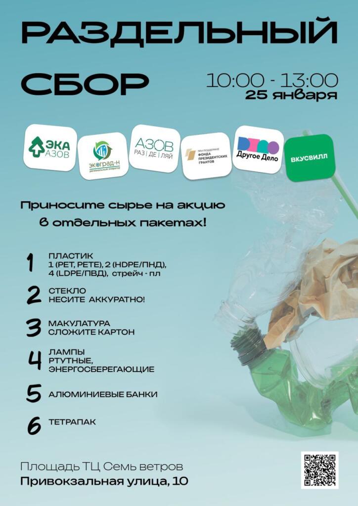 В воскресенье, 25 января, на площади перед торговым центром «Семь ветров» (район магазина «Перекресток») состоится общественная акция по раздельному сбору отходов «Январский сбор»