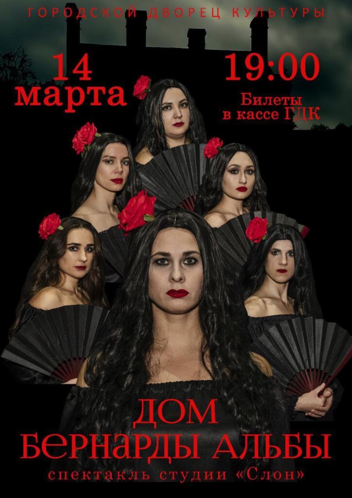 В субботу вечером, 14 марта, Городской дом культуры города Азова приглашает зрителей на спектакль «Дом Бернарды Альбы» в исполнении студии актерского мастерства «Слон». Постановка создана по мотивам одноименной пьесы классика испанской литературы Федерико Гарсиа Лорки