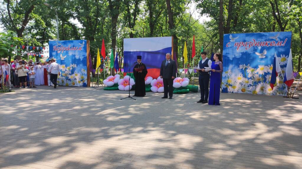 В День России в парке «Дубовая роща» города Кулешовка прошло торжественное мероприятие и концерт под названием «Обнимая Родину сердцем». Церемонию открыл иерей Олег, заместитель благочинного Азовского районного благочиния, который совершил благословение всех гостей.