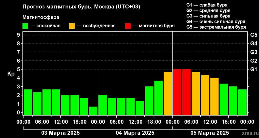 По информации лаборатории солнечной астрономии ИКИ и ИСЗФ, ожидается, что облако плазмы среднего размера достигнет Земли ориентировочно в 19:00 по московскому времени завтра. Наиболее вероятен (вероятность 60%) сценарий развития магнитных бурь класса G1-G2 (от слабого до умеренного уровня) длительностью 6-9 часов, начиная примерно с 20:00-21:00 по московскому времени. Возмущения магнитосферы могут продолжаться до середины дня 5 марта (среды).