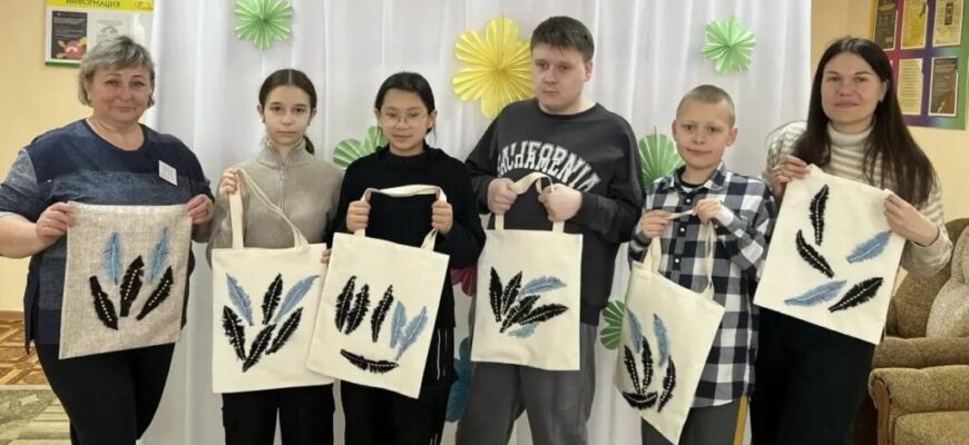 Взрослые и дети работали как единая команда: обсуждали дизайн, подбирали детали и пошагово оживляли холщовые сумки. Инклюзивный формат мероприятия был построен так, чтобы каждый ребенок чувствовал себя уверенно: никто не торопил, а поддержка родителей придавала смелости в принятии решений.