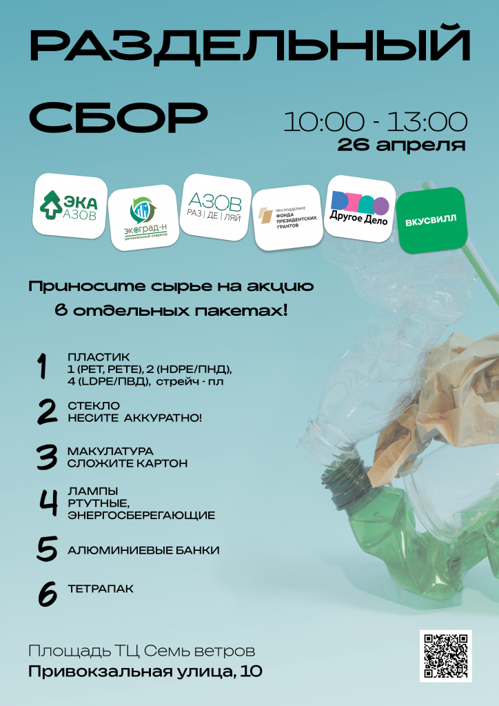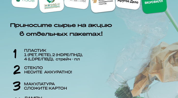 26 апреля с 10:00 до 13:00 на площади перед ТЦ «Семь ветров» (у магазина «Перекресток») состоится апрельская экологическая акция «Раздельный сбор». Мероприятие проводится при поддержке главного партнера проекта — ООО «ЭКОГРАД-Н»