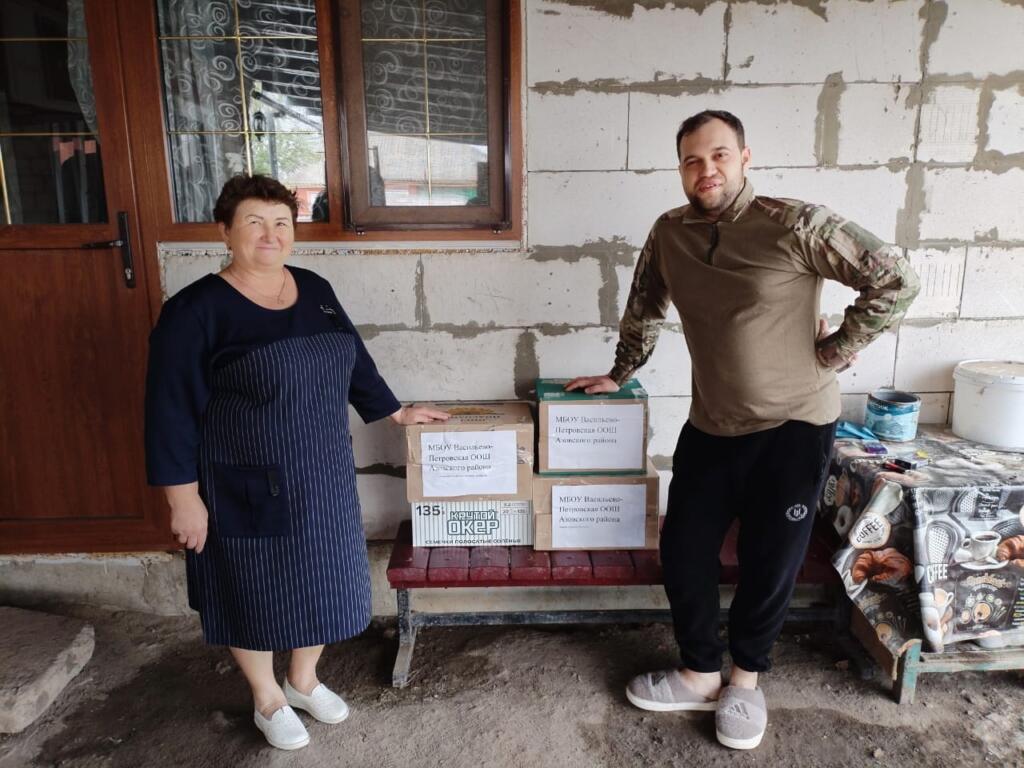 Директор Васильево-Петровской ООШ Светлана Петровна Лоенко лично привезла домой к бойцу Дмитрию Свинаренко гуманитарную помощь, собранную учениками и учителями основной общеобразовательной школы. Боец лично доставит подарки земляков в зону СВО.