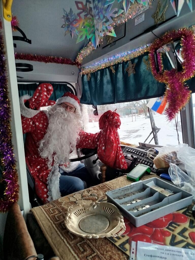 Водитель автобуса Азов-Стефанидинодар встречает пассажиров в костюме Деда Мороза
