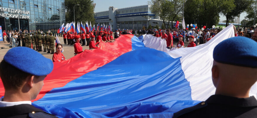 С праздничной датой собравшихся и всех жителей Донского края поздравил временно исполняющий обязанности губернатора Юрий Слюсарь.Перед историческим парком был развернут масштабный 60-метровый российский триколор, а также стяги с автографами командиров воинских подразделений, задействованных в СВО и участвовавших в освобождении населенных пунктов Донецкой и Луганской народных республик в ходе специальной военной операции. Как подчеркнул глава области, каждый такой флаг служит прямым свидетельством доблести, отваги и несгибаемой стойкости российских воинов.Обращаясь к присутствующим, врио губернатора акцентировал, что День российского флага является поистине всенародным праздником, сплачивающим всех жителей страны вне зависимости от их возраста, национальности или вероисповедания.«Это многовековая история России, слава наших предков, гордость за сегодняшние достижения и вера в большое будущее. С триколором совершают ратные подвиги воины СВО, спасают врачи, помогают волонтёры. Каждый, кто сегодня строит, учит, покоряет высоты в науке, культуре и спорте, – делает это под флагом России», — сказал Юрий Слюсарь.Со словами напутствия к участникам акции обратился Герой России, участник специальной военной операции Андрей Манухин. Он отметил, что флаг России олицетворяет собой единство нации, мужество и надежду.«Хочется отдать дать уважения всем тем, кто трудится на благо нашего региона и нашей страны. Особенно хочу поблагодарить защитников нашего Отечества, которые вчера, сегодня, завтра водружают флаг России над административными зданиями освобождённых территорий, доказывая всему миру, что наша земля должна быть нашей», — сказал Андрей Манухин.В этот день в честь праздника по всей Ростовской области организованы праздничные концерты, массовые велопробеги, спортивные состязания, выставки детских рисунков и книжные экспозиции.